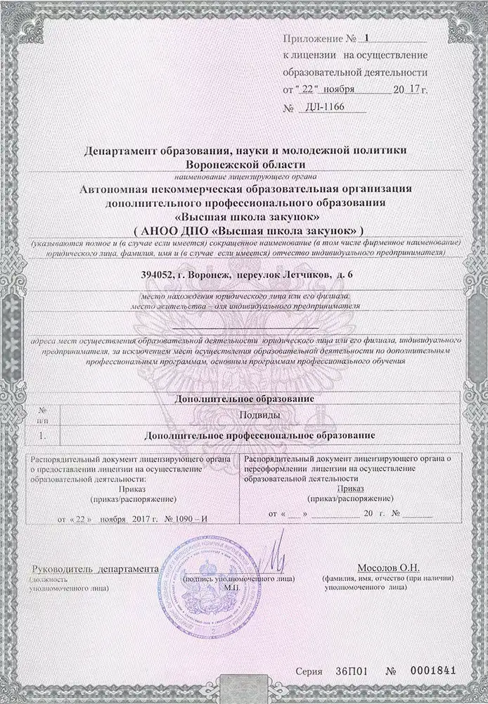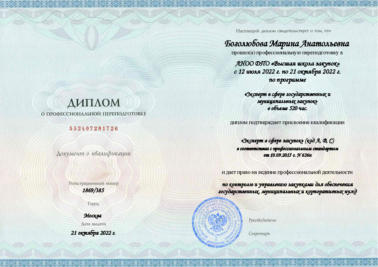 Диплом о профпереподготовке подтверждает вашу квалификацию "Эксперт" и дает право на профессиональную деятельность в сфере управления закупками по законам 44-ФЗ и 223-ФЗ. Этот документ вносится в Федеральный реестр сведений и является официальным подтверждением компетенции для контролирующих органов, включая ФАС.